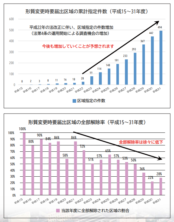 下図は、東京都において形質変更時要届出区域に指定された土地の件数の推移と、全部解除率を示しています。指定件数は増加している一方で全部解除率は徐々に低下しており、区域指定された状態で土地を利活用している事例が増えていることがわかります。