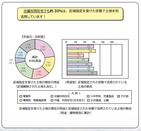 さらに下図では、区域指定を受けた土地の現在の用途と、指定された状態で土地を利活用している割合を示しています。基準不適合土壌が存在する土地であっても、健康リスクを回避する措置を行いつつ、適正に管理されたうえでさまざまな用途で利活用されていることがわかります。