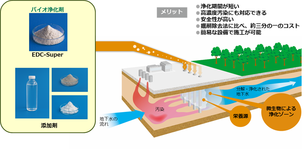創業まもなく自社開発した「EDC」は、バイオレメディエーションの弱点とされてきた浄化スピードと確実性を大きく改善した点が高く評価され、自他ともに認める代表製品となりました。